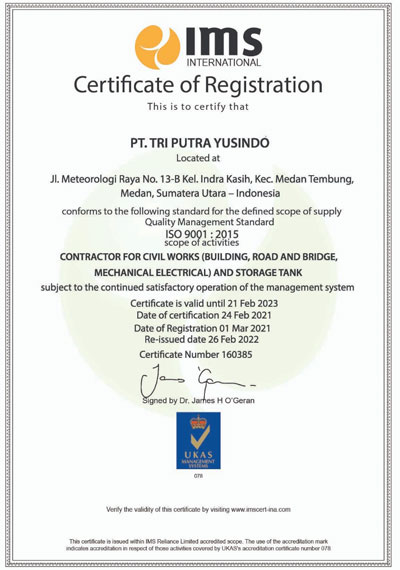 Perusahaan memastikan jaminan kualitas berdasarkan standar internasional seperti ISO 9001-2015-Quality Management System, ISO 14001-2015-Environment Management System dan ISO 45001-2018-Health and Safety Management System.